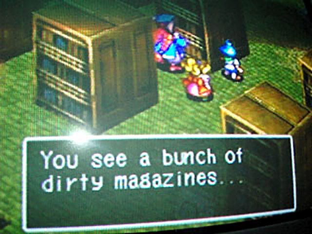 A random NPC standing outside the actual entrance to the tower remarks that “There’s a strange woman living here…a bookworm, yeah?” Yeah, because people who read books are total weirdos. The NPC warns Alf about the aforementioned traps, but Alf is determined to advance the plot, so bravely marches on anyway. After an upwards slog of random battles, Alf and Miss Piggy come across a convenient restroom, complete with save point and bookcases filled with information about machines and [crack], which I won’t go into here, as it’s boring and irrelevant. Basically, the reams of information boil down to this: many machines are powered by [crack]. Maybe that’s why the BoF world seems so fucked up? Anyway, after a quick rest, the dinky duo continue to make their way upstairs. I should mention that I fight several floating robot-type things along the way, which tremble and shake as though they need a new [crack] fix.