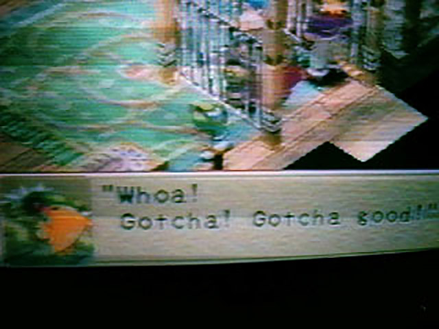 Moving on…our insipid heroes emerge back outside the mayor’s house, where a handy message tells me that the door is trapped, and I’ll have to find another way inside. No shit. I really hate these messages that keep popping up at strange, unnecessary periods, because they remind me of trying to write recaps in Microsoft Word while being distracted by that stupid fucking Clippit every ten seconds. Oops, that was a big tangent. Aaaaaaaanyway….right now, it would be easy for a first-time gamer to not know what the hell to do next. Since I’ve played the game multiple times, however, I know that the only way back into the mayor’s house is to fall down one of the holes I mentioned earlier, and find a ladder that leads up through a trapdoor into the mayor’s living room. ::takes breath:: Now I have to talkto the evil fucking SteveIrwin!Parrot: