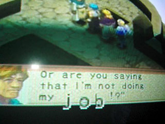 Upon learning that Chino, possibly the most annoying urchin in RPG history, has gone missing, I make no effort to suppress my hopes that the Child Catcher from Chitty Chitty Bang Bang is currently holidaying in Synesta. The frog kid who was previously seen chattering about his new clothes reveals that Chino “said he was gonna hide in the cellar or something”. Hearing this, Sister Fellflatonface practically has a seizure – apparently Synesta has a vast area of underground rooms and cellars that were evacuated during the Hex and haven’t been used since, and there are monsters down there and it’s OMG SO DANGEROUS and what are we going to DO? Won’t someone think of the children?! We see a helpful shot of the entrance to the cellars during all of this. The entrance, located on top of the city wall, has its own guard, leading me to wonder how the hell Chino managed to sneak past him. I won’t even try to make sense of it, so let’s just say that the guard is an incompetent drunk who turned to alcohol when his wife left him for another woman. It has to be more interesting than the next portion of the game, at least.