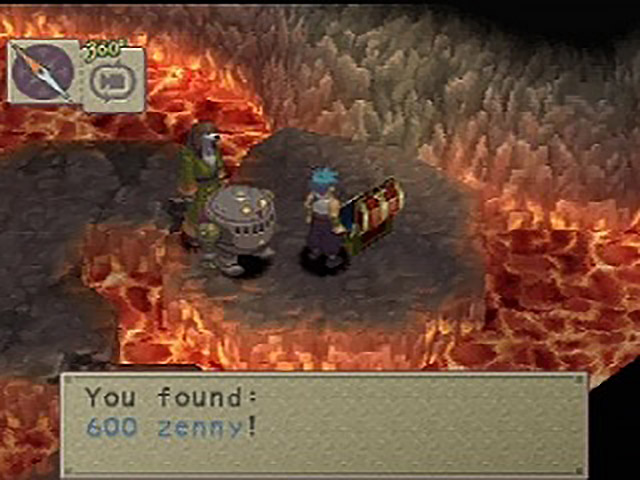 In the next room, Ruley finds a very out-of-place treasure chest filled with zenny. I don’t even know. The only other interesting thing in this room is a gimmick where the handful of platforms over the lava change positions after every random battle, meaning that the group has to run around aimlessly until they get dragged into a fight in order to reach the exit. I don’t think I’ve ever seen a more transparent method of foisting random battles onto the player, but hey, we’re only a third through the game–give it time.