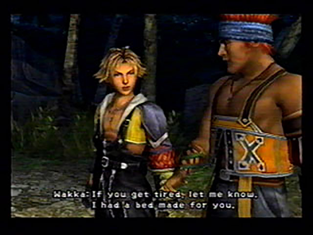 Wakka enters the hut to find Tightass standing there. You know, if you’re going to eavesdrop on someone’s conversation, you could at least be subtle about that fact. Tightass wants to know who Chappu is. He’s Wakka’s dead brother, who looked a lot like Tightass. Now that’s just sad. I hope he didn’t bleach his hair and wear wanky clothes. Chappu died fighting Sin with the Crusaders a year ago. I’m guessing Lulu was getting it on with him, although Wakka makes no mention of that. Tightass realizes that Chappu’s death was the reason that Wakka couldn’t concentrate on the blitzball tournament. But he doesn’t seem to feel too bad about totally brushing it off as an “excuse” earlier. Wanker. So now we know Wakka’s Tragic Backstory — he wants to avenge his brother by helping to defeat Sin. Even though blitzball is more important to him at the moment.