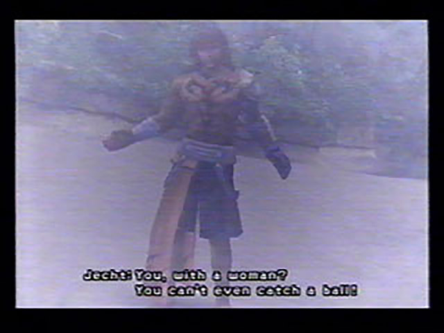 FMV mode. The speaker is the guardian chick, whose name is Lulu. She’s saying that “he” looks like someone named Chappu. I’m guessing that the “he” in question is Tightass, and Chappu is the guy who’s dead. Lulu is quite vehement about Tightass not being Chappu, and she chides Wakka for bringing him to the village. Yeah, I’d be pissed, too. I like Lulu already. She’s totally bitching Wakka out, as he stares at her breasts. Wakka says he just wanted to help, but Lulu won’t have any of it. She tells Wakka to cram it, and then walks off. End scene.