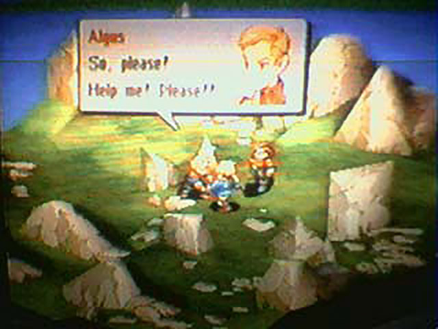Brief intermission from the dialogue as the screen goes black to allow the Generics time to clear out all the dead bodies, and then we return to Cesario, Delita, and Algus. Introductions all around, and when Algus find out that Cesario is a Beoulve, he forces his way into the party and demands that Cesario help him rescue the Marquis. Jesus, this guy is worse than a fricking Mary Sue. Just to spite him, Algus will now and forever be known as Princess Pissy Pants. Heh.