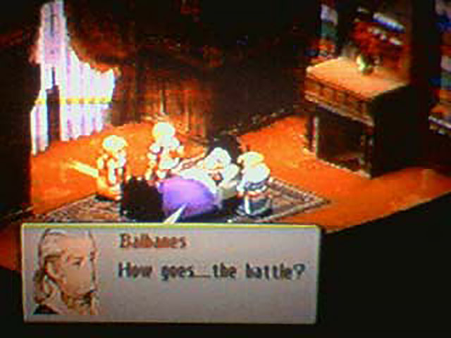 Anyway, after accomplishing party-wise in a few minutes what has taken me hours to do in the past, I send the party to Igros Castle. When the screen returns from the Black Screen of Perpetual Loading, Foulfellow is sitting at the head of a table, flanked by Cesario, Delita, and PrincessPissyPants. FF strokes Cesario’s ego a bit for crashing the Happy Sunshine Cult Party before cutting to the chase. He tells the trio that he dispatched Gideon to find the Marquis, but PPP stands up and demands to have some soldiers of his own to go and find his hot Marquis man. Everybody, including yours truly, rolls their eyes and groans “he just took care of it, dumbass.” FF suggests that the trio stay and guard Igros castle instead, like they were supposed to anyway, according to the Academy, and the scene ends.