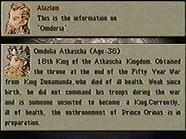 Chibi!Cesario emerges from IGROS CASTLE on the world map just in time to see a RED form two dots to the south, but before that, he decides to check his facts in the “Brave Story,” an option on the menu that displays the many biographies of The Cast List That Puts IT!!! to shame. With this comprehensive and constantly-updating tome at his disposal, Cesario quickly does some research on the aforementioned King Omdoria, and his wife and son. The entries read that Omdoria, or Omdolia, depending which line you are looking at, is the current king and in pretty crappy shape. Not only that, but his only son is too young to rule when daddy takes the nap that needs no alarm clock and the Queen is too weak to have another kid or even rule in her hubby’s stead. This matches up pretty nicely with that lovely intro video from last time, so I guess this whole little episode takes place before the King actually dies. Well, at least I’ll be spared some NPC blowing all this exposition my way somewhere down the line, right? Yeah, I didn’t think so either, but it was nice to dream about.