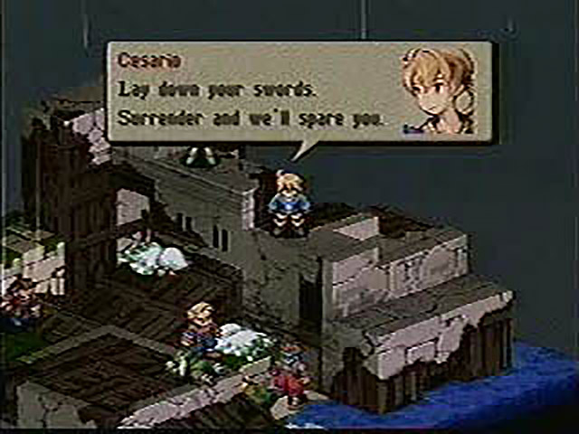 The screen goes black to give the Generics time to drag all the dead bodies off screen, and when we return to the hideout, Miluda, suddenly re-animated, begs Cesario to kill her if the commoners are “just animals,” like PPP claims. Cesario is dumbfounded, but PPP bitches for Cesario to kill Miluda before she bleeds on him or something. The actual prodding takes forever, because PPP reiterates himself a lot, but Cesario remains motionless and I remain uncaring about anything PPP has to say. Delita comments that he doesn’t understand why Miluda is the enemy, causing PPP to bitch him out too. Shut up, PPP!
