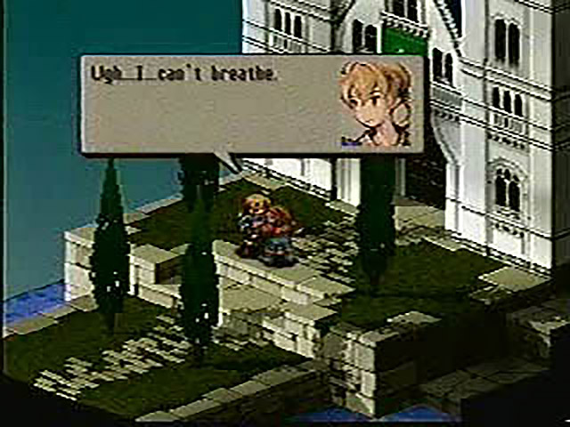 “Meanwhile, at Igros, capital of Gallione, Beoulve castle…” Delita’s sister, Rinoa, screams to be let go. A solid THWACK! hits the soundtrack and the camera swoops into action just in time to see a Happy Sunshine Cultist ride away from Beoulve Castle with Rinoa’s limp form straddling his eager Chocobo. Ouch, I feel as though somebody just force-fed my imagination bleach. A second ChocoCultist, named Golagros, yells for somebody inside the castle to hurry the hell up, and a Generic thief emerges, dragging Alma along by the wrist. Alma screeches for her brother, and Gideon comes rushing out of the castle. He pushes Alma away from the thief and kills him with a wave of his hand. At least, that’s how it looked. Sprites. *shrug*