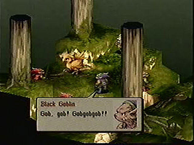 A Pick-up Round of Generic Square Dancing gets everybody limbered up for battle as the camera fades up on a lone Chocobo surrounded by a throng of multi-colored Goblins. A Black Goblin steps forward to enunciate, “Gob, gob! Gobgobgob!! Damn, bitch, why you gotta be bringing that shit into my house?” and the Chocobo replies, “W-Wark!! I jus’ wanted to score some rock, essé!” A Red Goblin on the outskirts of the gang turns around as he hears Cesario’s infernally loud Birkenstocks clamoring around off-screen and shouts, “Gob, gobu–!! Shit, it’s the man!”