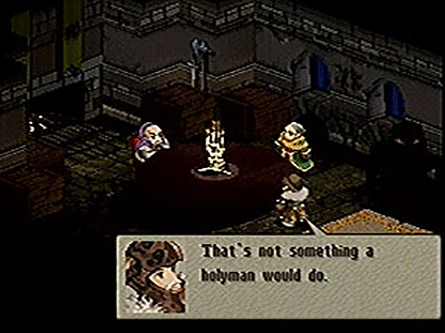 The Camera spirals down around the mast of a boat in WARJILIS TRADE CITY. Cesario emerges from a below-deck cabin and walks across the dock, noting to himself as he goes that there don’t appear to be any troops from LIONEL out and about. Instead, he soon finds out, there’s the Dearly Departed Delita, who appears as if on cue to harass Cesario for trying to get involved in the Princess/Stone fiasco unfolding before our very eyes. The Dearly Departed Delita tells Cesario that while Cesario can only save Ophelia from one of her problems, The Dearly Departed One can save her from all of them. Whatever that means. Cesario is too smitten with the Dearly Departed Delita’s stunning Golden Armor to ask the questions he probably should be asking, and frankly, I just don’t give a damn, because we all know that Cesario’s going to end up being the one doing any and all saving in this game anyway, regardless of what anybody might say to the contrary.