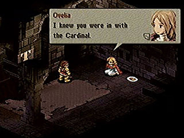 Ophelia’s all “I’ll never be your puppet!” and Vormav is all “We just want to help you take the throne!” and I’m all “Why the hell isn’t this scene over yet?” Then Vormav lets Ophelia know that he’s on neither W!LL nor B!LL’s side, he’s just in it for himself a “collaborator.” Then Dracula tells Vormav that he’s leaked quite enough for one day, and suggests that the three men leave Ophelia alone with her thoughts for awhile. As Dracula and Vormav make for the door, Dracula declares that “once [Ophelia] comes to her senses[,] she won’t refuse [their] help.” The Dearly Departed Delita gives Ophelia A Look Wrought With Significance before he leaves.