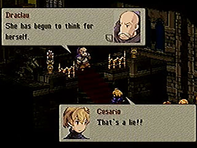 Dracula tells Cesario that, if Cesario doesn’t want to face the wrath of a crotchety old man with an overwhelming amount of religious zeal fluttering around in his head, he’d better fork over the Yellow Holy Stone that GM found in GOUG. Cesario flatly refuses, demanding to know where Ophelia is, instead. I wonder how much longer the game designers are going to try to convince us that we actually care about Ophelia’s well-being. Dracula tells Cesario that, without power, he can’t hope to help Not!Princess Ophelia, and when Cesario again demands to know where the Not!Princess is, Dracula exposits that Ophelia chose to accept his help and left for ZELTENNIA with Vormav, like, eleven months ago. Oh. …Shit.