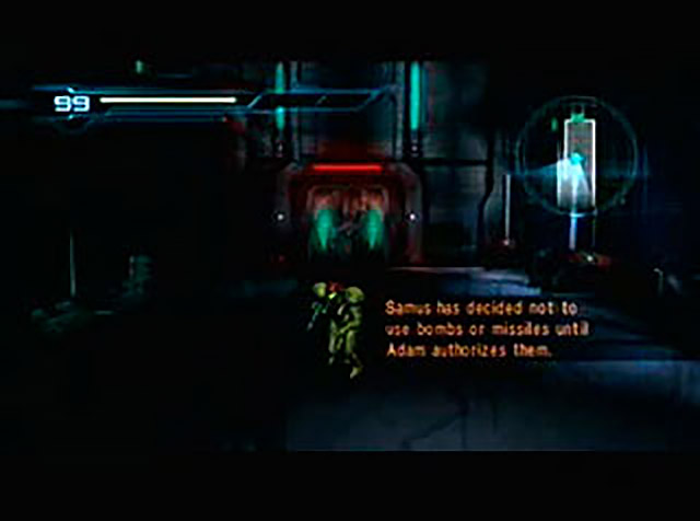 The other Space Marines are impressed, but Adam just shoots Samus a sidelong glance. Now that the door is open, the Space Marines file through, with Anthony and Adam bringing up the rear, leaving Samus alone with her thoughts. Such as they are. “Adam hadn’t authorized it, but I decided to remain on-site for the sake of the others.” And the best way Samus can think of to help, apparently, is by totally enfeebling herself, because a little tutorial window pops up in the corner of the screen to alert me to the fact that “Samus has decided not to use bombs or missiles until Adam authorizes them.”