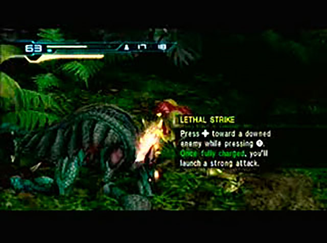 The next room is long and relatively wide, and completely camouflaged to fit the Biosphere’s natural decor, with flytrap-looking plants on the walls and vines and foliage covering the floor. Samus dispatches two Grippers near the entrance, and then slides down a very long and steep dirt slope, eventually finding herself at the beginning of a dirt path lined on both sides by jungle flora. Geemers and Wavers fill this lower area, and as they are killed, more appear from the jungle environment, so Samus runs past them until she can see a clearing and a locked hatch in the distance. As Samus heads for the hatch, she hears a monstrous screech, and in first-person mode we see a large cannonball-esque object roll down from the right and into the clearing. The cannonball charges at Samus, who leaps over it and sprints to the clearing. The cannonball is hot on her heels, and when Samus sensemoves out of its way and shoots it, the cannonball uncurls and reveals itself to be a Griptian (“Armadillo On Steroids”). The Griptian’s general attack pattern is to roll at Samus, unfurl itself to slash at her, or dig underground and try to ram Samus from below. Samus uses her sensemoves to dodge these attacks, and after she’s hit the Griptian with a few charged shots, it assumes a wounded position. The tutorial window can barely keep itself from crying “FINISH HIM!” and pops up to remind Samus that she can deal a lethal strike to tuckered-out enemies by tackling them while charging her arm cannon. Flipping him onto his stomach, Samus holds the Griptian in place with her foot and blasts it in the back of the head. Yikes. Just to make sure the victory wasn’t a fluke, the game makes Samus fight another two Griptians, who also get the Cosa Nostra treatment.