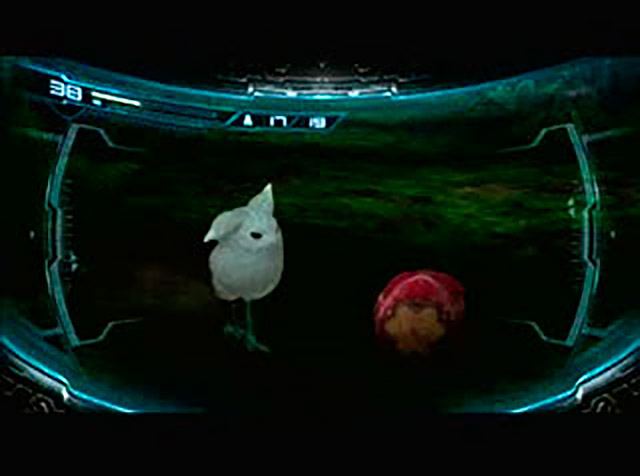 Samus heads back through the terrarium hallway and into the jungly/dirt path room where she fought the Griptians. As Samus heads down the dirt stairs and toward the clearing, the camera watches her from a strange location, near the ground and to the right of the path. The hatch in the clearing is still locked, so Samus heads toward the camera to investigate, but she doesn’t make it very far before a rustling noise hits the soundtrack. Samus skids to a stop, and, in first-person waggle mode, the game sends me on a scanning expedition, like at the beginning of the game, to find whatever it was that caught Samus’s eye. Samus zeroes in on the previous location of the camera, near the ground on the side of the path, and as she zooms in, a hard-shelled fruit rolls out onto the path, followed by a tiny, chirping, fuzzy thing with sinister eyes. It looks like the demonic offspring of a Moogle and a Chocobo. Durr, could it be the dark intelligence Samus was just alluding to a moment ago? The one that killed Joe Bloggs in the Breeding Room?