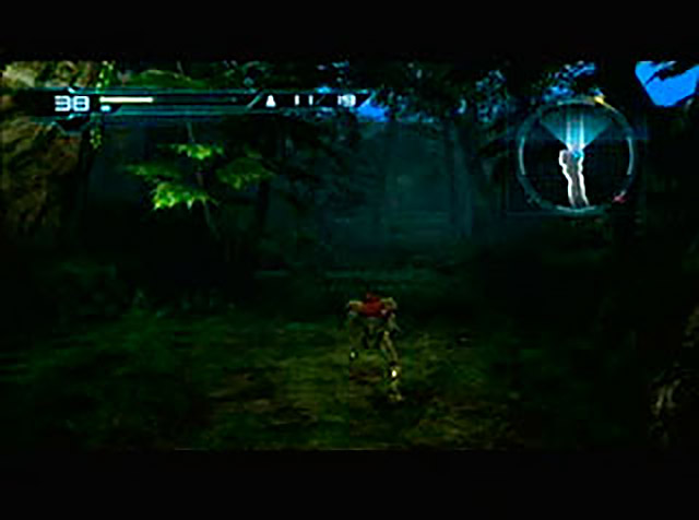 On the other side of the hatch is another long, jungly path. Samus heads forward, destroying Reos and Fly Pods as she goes, until she unexpectedly reaches an invisible force-field of sorts that she can’t get past. Backtracking a bit, and looking for another way around, Samus notices some glowing bugs crawling out of a log above the left side of the path. Samus grabs on to the edge of the log and morphs into a ball as she pulls herself into it. Rolling through the log, Samus finds herself in a small, elevated clearing with a large, camouflaged machine. The machine, which resembles a lighthouse, drops its camouflage as Samus approaches, and when Samus interacts with the machine, we learn that it’s a holographic projector. Samus uses the machine to deactivate some of the holographs in the room, revealing a hatch where Samus had just been stuck moments ago, and a blue dildo hidden along the side of the path. Samus leaps back down to the path, grabs the dildo, and heads through the new hatch.