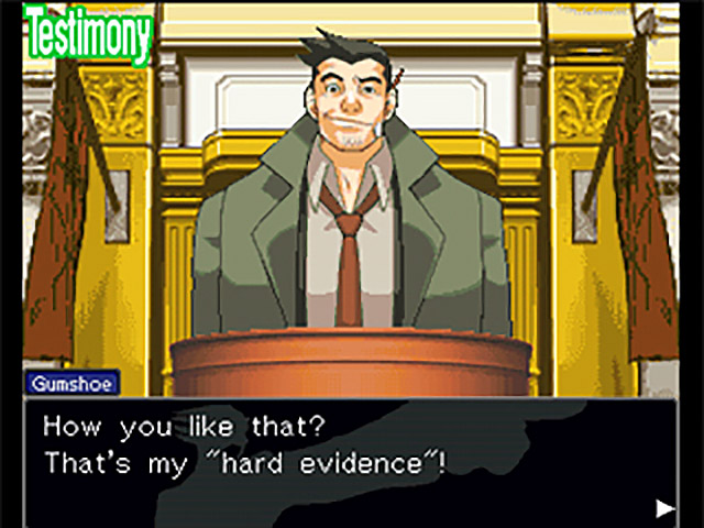 The title of this second testimony is “Hard Evidence,” just so you guys know. I love this. Gumshoe relates his examination of the crime scene, during which he found the note with Maya’s name on it. “Lab test results showed that the blood was the victim’s!” he says, adding that there was blood on Mia’s finger as well. We all know that Maya didn’t do this thing, and that there are all kinds of ways this could be less than what it seems: there is no proof that Mia wrote it, and no proof that the writing of the name means Maya is the culprit. But the way the peanut gallery reacts, you’d think Gumshoe had just pulled out Maya’s signed and notarized confession.