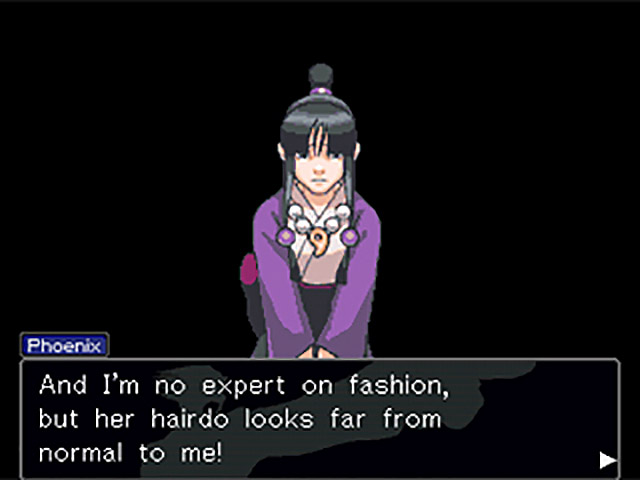 So how did Phoenix come to this conclusion? Well, let’s remember that Phoenix has an eye for design, despite his bad hair and pink tie, and his inner fashion plate simply cannot believe that Maya’s figure would be the first thing anyone noticed about her. “If you had really witnessed my client, Maya Fey… You would have noticed her clothes before noticing her physique!” The Startling Revelation Music thrums in the background as Phoenix notes how odd Maya’s wardrobe and hairstyle are. “However, the witness’s testimony mentions neither of these things!” he yells, all pointing fingers. And that, per Phoenix, is enough to render the whole account “bogus.” How dare the witness not comment on the fashions witnessed at the scene of the murder!