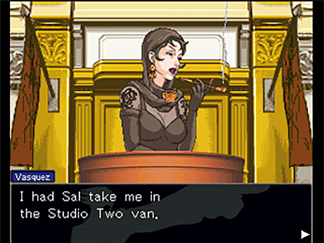 Vasquez’s testimony more or less echoes Sal’s–meeting, 15-minute break, T-bones, et cetera–with one extra detail: Vasquez was “fatigued” after the meeting, so she had Sal drive her to the Studio One rehearsal in the van parked by Studio Two. A four-hour meeting does sound exhausting, admittedly. During the cross, Vasquez is as rude to Edgeworth as she is to Phoenix, because she’s a bitch, if you haven’t gotten that yet. When she says “I was fatigued, so I had Sal take me,” Phoenix demands to know what that means. It means I just lost my appetite, Phoenix.