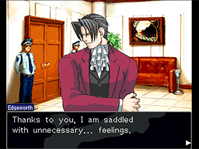 Speaking of Maya, she turns up to congratulate WP. He tells her he’s just happy because he can go back to being the Steel Samurai. Awkward! Before Maya has to deliver that news, though, Edgeworth shows up because he’s been waiting ten goddamn minutes in that closet. Over some sappy music that I choose to call the Lawyers’ Love Theme, Phoenix ignores the obvious reason Edgeworth is there and thanks him for his help in the courtroom. Edgeworth responds, “I must say, Wright, I hadn’t expected to meet you in court after all these years.” Maya’s got her “Oh snap, gossip!” face on. “However,” Edgeworth goes on, “In retrospect, it would have been better had we not met. Thanks to you, I am saddled with unnecessary…feelings.” Tingly feelings. Edgeworth insists that these feelings are dragging him down, and says, “Don’t ever show your face in front of me again.” I’m sure Phoenix facing away from him can be arranged. Maya insists to WP that Phoenix and Edgeworth are rivals, not friends with benefits, but Phoenix says, “For now we are…I guess.”