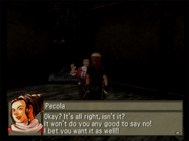 Now, the reason Marvy is still on this useless rock is to recruit a woman named Pecola. She is an interior designer, so for once Marvy is personally invested. To this end, he talks to a woman having a stitch and bitch with her friends outside the inn. This woman, creatively named Woman, is supposed to provide Marvy a book, also creatively named Interior Design Book. This was a 3 p.m. on a Friday affair for the writers. But when Marvy speaks to Woman, Woman only tells him, “I hope the book I gave you comes in handy.” Now, you’re smart. It’s why you spend your precious time reading my deranged thoughts on old, bad games like this. So you’re probably thinking, “Woman almost certainly gave Marvy Interior Design Book on a prior trip to Middleport in which he Talked to Everyone.” You might not be thinking it in that exact phrasing because the Trumpian capitalization hurts you, but something in that spirit. Let me reassure you now that you are correct, as a comfort for what I’m about to do. Which, I’m sorry to say, is “go back and forth to the boat several times to attempt to reset the possibly bugged Middleport Book Club NPCs who won’t give Marvy the stupid book.” In this entire 10-minute span, did I once open the inventory to see if the book was already there? I wish I could say I did. Yelling yourself hoarse at a version of yourself from the very recent past for being incurably daft is really not as fun as it sounds.