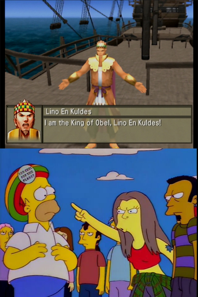 The simple task of sailing the ship from one nearby island, it should go without saying, is needlessly difficult and frustrating, but 20 minutes later, after the pride of the high seas here has U-turned itself away from Obel’s dock five or six times because it sensed I wanted one more random battle, a cutscene shows the Rudderless gliding over the water toward its birthplace. Nico shouts that the Kooluk’s second fleet is “straight ahead.” It’s three boats, for the record, but I’ve been calling the same number a fleet when they’re my ships, so fuck me. Elenor indicates they should proceed with their plan, and to that end, King Lido walks onto the Rudderless’s bow. He is, I’m sure to Molesley’s delight wherever he is, finally wearing his best kingly regalia. Unfortunately, our man here is about seventeen shades too white to be anywhere near said regalia. He looks like a fucking Benetton ad, but with a purple bow around his waist. “I am the King of Obel, [Lido] En Kuldes!” he announces, without the benefit of anything that would carry his voice to anyone who cares (which would still be no one). His speech continues as we see the approaching boat from the point of view of Flarey Sue, Molesley, and their ragtag band of Obelian resistance fighters, and yes, they can somehow fucking hear him from a mile away: “Here I come! The land of Obel shall be mine once more! My blood shall serve Obel once again!” Flarey Sue somehow does not mutter so loudly her dad can hear, “I’ve been here THE WHOLE TIME.”