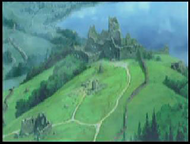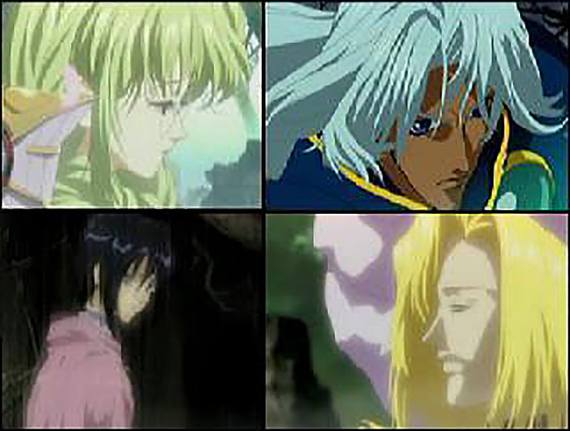 Lightning strikes and we see Pink-Cloaked Elfin Depressive moping around some more. And in case we didn’t understand by now that these people are all despondent and angsty, he’s standing in the rain. Cue the fucking violins already. In the next scene, even the birds sound depressed as an extremely effeminate man (even by previous standards) with long blond hair, a banjo and a gigantic mauve hat with feathers protruding from it, stares joyfully — just kidding! — at the ground, then looks to the sky, his pensive expression etched onto his face like markings in stone. In the next scene of The Most Depressing Intro In History, Blond Hero and Scantily-Clad Depressive watch a beautiful sunset together. Well, that part wasn’t too angsty at all. I’m in shock! Now, yet another montage of the characters and their huge swords. We fricking get it, SWORDS ARE IMPORTANT. And in another shock moment, some of them are actually managing to smile! The characters, not the swords. In the final intro scene, we once again see the darkened room with the chained sword – but this time the sword is gone. Dun dun DUN!