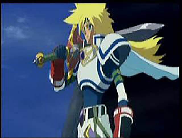 The obligatory overblown anime intro starts with a shot of an ornate sword (complete with what appears to be a huge eye set into the hilt) chained to the wall of a darkened room. The fabulous purple “Tales of Destiny” logo appears as nicely-dramatic music bubbles away in the background. Next is a pan over some windswept green land, complete with ruined castles dotted over the landscape, as the music turns all Celtic. It reminds me a lot of my beloved Wales, until a dragon’s roar shatters my reverie and a great grey beast flies overhead. Not Wales after all, then. The music turns heroic and grandiose, signalling an imminent Brooding Hero Shot. Sure enough, a feminine-looking man with laughably oversized shoulder pads and, quite frankly, ridiculous blond hair, fills the screen. Well, it’s mostly his hair. Think 80’s rock star meets Rapunzel in a hurricane and you’ll be on the right track. That flowing mane probably weighs more than the humongous sword (yes, the one from ten seconds ago) in his hand.