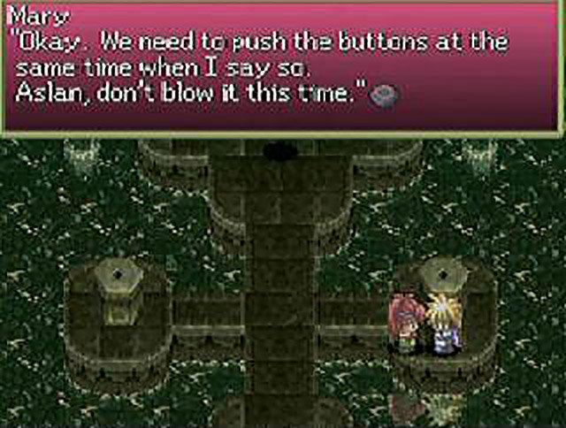 Finally everyone seems to agree that standing around isn’t going to get Rutee down from her airborne prison, as Mary instructs Aslan to stand in front of the eastern penis monolith. She approaches the western monolith and prepares for the next step of the instructions. But before she can tell Aslan not to press the button on the pedestal, you know what happens? You’ll never guess. Seriously, this is straight out of left-field. Aslan presses the button! Oh, this game never stops surprising me. Before Aslan can dive for cover, he is propelled into the air and trapped, just like Rutee. Speaking of Rutee, she seems to be as pissed off as I am regarding Aslan’s infinite stupidity. “Hey! What do you two think you’re doing?!” she screams. Aslan and Mary, flustered, try to placate her, but to no avail. “I don’t believe this. @#$%!! Is your head just an ornament?!” she yells, venom pouring from every word. Another snarky character who hates Aslan? There is a God after all! Rutee and SoS should just do away with Aslan and Mary, then the rest of the game would be about their snark-filled adventures. That would be so cool.