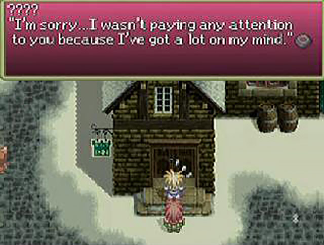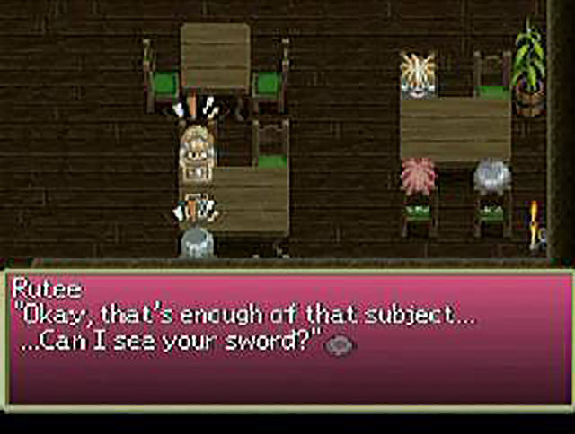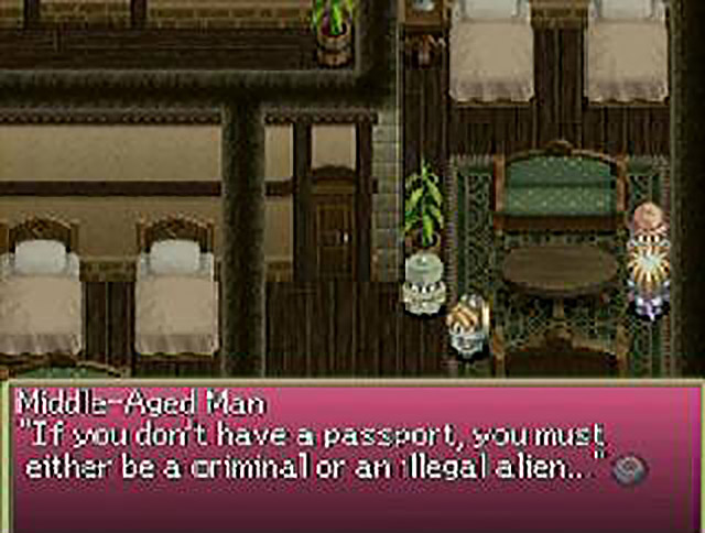 After leaving the temple through another exit and battling through the snowfields for what feels like several eternities, the party find themselves entering Janos via the northern exit. Well, ain’t that handy! Upon entering the town, Aslan is stopped by one of the guards, who gives him a passport. “Here is your passport. If you lose it, you won’t be able to re-enter Seinegald,” he reveals. Um, what? Isn’t the whole concept of passports about needing one to cross a border and enter another country — not, you know, being handed one by a guard every time you enter town? Whatever. Rutee drags the others over to the first place every adventurer worth his or her salt should go: the One Million Roses Tavern. They all sit at the table previously occupied by The Black Wings (personally, I would check the seats for stains) and Rutee, never one to beat about the bush, asks Aslan where he’s going. When asked if he’s “going to join the army or something” (Rutee, are you insane? That would require a haircut!) Aslan replies in the negative. Curiously, this silences Rutee for a while. But not too long. “By the way, where are you from?” she continues. Aslan tells her he’s from a village called Lienea, in deepest Fitzgald, wherever that is. Rutee seems simultaneously horrified and overcome with mirth about this, screaming “That means…you’re a country boy!” “Who’re you calling a country boy?!” Aslan fires back. Here’s a clue, Aslan. She’s talking to the guy who just said he comes from the country. I know your brain cell may not be able to cope, but please try to comprehend this fact. Rutee, finally realising her sparring partner has the mental capacity of a sausage dog, spells it out for him — “You, it’s Y…O…U!”. Don’t confuse the lad, Rutee. I don’t think he’s gotten that far along in the alphabet yet. She now mentions that the only place in Fitzgald worth visiting is somewhere called Neuestadt, and declares she’s never heard of Aslan’s podunk hometown. Desperately trying to gain the upper hand in this argument, he turns the tables on her and asks where she is from. “Why, I, I was born into a good family in Seinegald!” Rutee exclaims. Yeah, sure you were. In other news, I hear Hades is experiencing record cold spells this January!