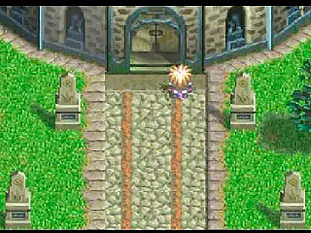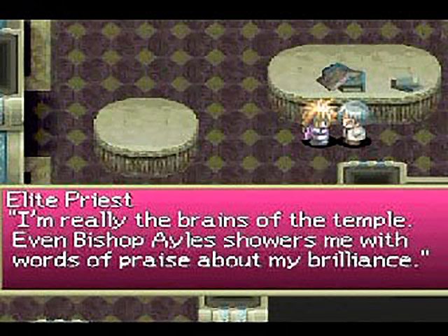 The BGM for this area is a vaguely-creepy church organ tune, just to drive home the point that Something Is Wrong Here. I’m just glad the characters themselves can’t hear the background music — if that were the case, they’d probably spend another ten minutes talking about how ominous it is. Back in control, I have Aslan thoroughly search the grounds of the temple, because I still hate myself after my epic fail from earlier and feel the need to punish myself in some way. Fortunately, most of the outbuildings and annexes in the area have been bombed in, rendering the doorways impassable, so all that remains to explore is the temple itself and a separate cathedral to the east. There are a few decorative priest corpses littering the aisle of the cathedral, one of whom isn’t quite as deceased as the others — with his final breath, he tells Aslan that the bishop is hiding in a back room with a few other survivors. Survivors of what, I hear you cry, but we don’t actually find out yet. Checking the back room, Aslan finds the bishop, who doesn’t know what the fuck is going on either. Apparently the archbishop is still missing, so Leon decides they should go find him. I hope they all have a few spare years in their diaries, since I can’t foresee myself finding my way around this place as easily as they expect me to.