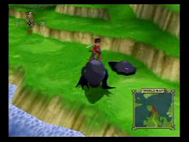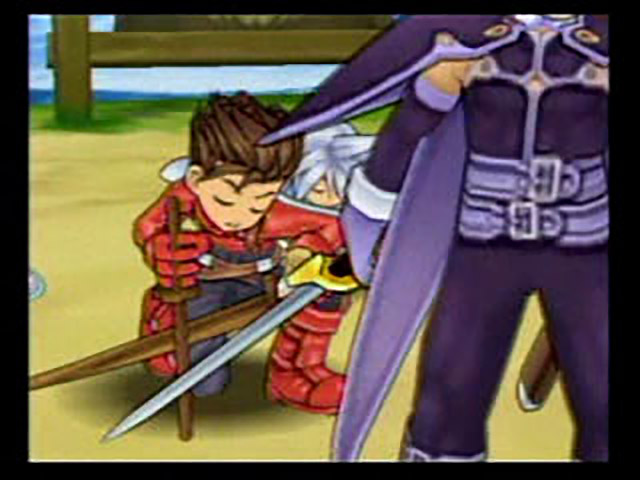 Lloyd wants to know who the fuck this guy is. “Get out of the way,” Purple Studmuffin responds. This is gamespeak for “Let’s cut suddenly to the battle screen where you and Suelette are inexplicably standing in front of me as I cast a spell from the back row.” Whoops. PS brings two things to the party, besides his fabulous fashion sense: a phallic sword and a healing spell. Okay, he can stay. Comically, when the battle is over, Flail Guy whines about his defeat by “a bunch of kids.” Yeah, that is pretty sad.