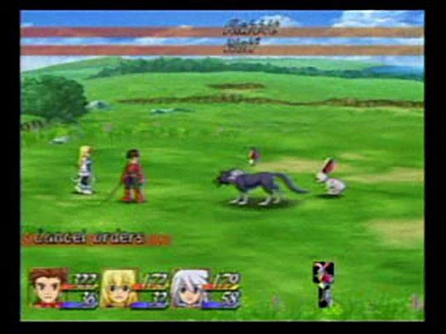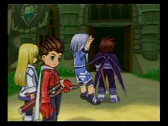 Satan Beard demands to know the whereabouts of the Chosen. The old lady — oh hell, we know it’s Suelette’s grandma — steps fearfully backwards. On cue, Suelette and the others appear at the top of the steps. Satan Beard — whom one of his underlings refers to as “Lord Botta” — threatens, “Chosen One, your life is mine!” Or maybe he’s hitting on her. It wouldn’t be the first or last time someone does that in this game. “I won’t let you Desians get away with anything!” Lloyd growls, whipping out one of his swords. One of the unnamed cannon fodder soldiers finds it hilarious that Lloyd refers to them as Desians, indicating that they are possibly not Desians. This, obviously, is too subtle a nuance for our rocket scientists to notice. But Desians or no, the clone soldiers are still big enough shitheads to attack this group of teenagers.