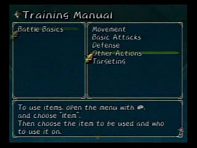 When Lloyd admits that yes, he’s learned all his skills through trial and error, Kratos emits an anime ellipsis and walks forward to hand Lloyd an invisible object. He also slips in a snide remark that basically implies Lloyd’s lame sword skills won’t do shit for Suelette, then walks away to let Lloyd stew in his own juices. Not like that. This little exchange gives me the Training Manual, a tutorial on the ten thousand different battle techniques and options in the game. I read through it just in case I find any amusing screenshots and also to see how many strategies I totally disregarded in my last playthrough.