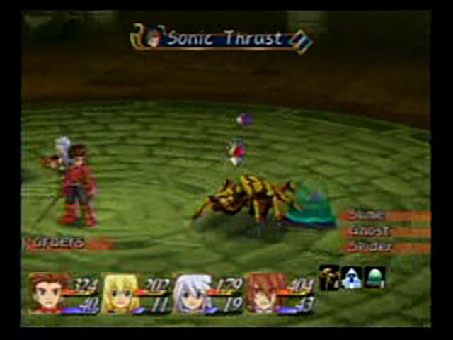 Afterward, Lloyd takes the staircase to the right, where he’s immediately attacked by a white undulating penis. As one might expect, the penis contains a ghost, a slime, and a spider. Oh, happy day! How lucky am I that both my new recapped games include spiders? If my 12-year-old wiener wasn’t so tiny, I’d totally tell the game designers to blow me. Pretty much all the enemies are of this simple variety, meaning that Martel must have the lowest standards of any goddess anywhere. Shit, Tidus could practically beat this crappy trial.