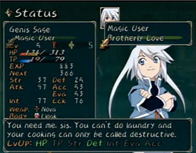 In another news flash, Lloyd expresses his desire to join Suelette on the Magical Mary Sue Journey (henceforth referred to as MMSJ). So does Penis, except he tries to make it seem like he wants to go along with his big sister and not his crimson-clad butt buddy. I don’t think anyone is fooled. Kratos nips their boyish fantasies in the bud. Basically, he doesn’t want to babysit the two of them in addition to Suelette. Although it’s not really babysitting if Lloyd is his kid.