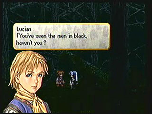 Lucian, too, is struck dumb from wank, and glowers at Platina at length. Finally, he clues a sister in, literally, as he tells Platina how he knows for a fact that the men in black are slave traders. Turns out they came to his house one day, and the next, his sister had vanished. Platina’s VA delivers an unintentionally hilarious line: “Wha? But everyone said she was stricken with a disease…” I totally expect the woman who voices Platina to use language like that at, like, a Ren-Faire, or something, but coming from Platina’s infantile countenance, it just seems silly. Lucian: “Oh? Have you ever heard of a disease that makes you disappear?” I wish these two would catch a disease that makes them disappear.