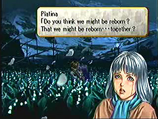 We open on an overcast day, gazing at the sun (and its obligatory lensflares) through a cluster of bare, finger-like tree branches. Water babbles nearby. The frame slides slowly downward, displaying snow-capped rocks and a clearing in the middle of a thicket of bare, dead-looking trees. Some black text announces that this game is an ENIX presentation, as well as a Tri-Ace “creation.” We see a small girl with long “silver” (but actually violet) hair gathering water from a brook. The girl is wearing peasant garb and looks like she’s about seven years old. The idyllic atmosphere is shattered when the jarring voice of a thirty-year-old woman hits the soundtrack in the form of a voiceover, narrating the girl’s dialogue. “I must hurry!” thirty-year-old “little” girl voice says. Then, showing us just how powerful her sense of urgency is, the girl, who we learn is named Platina, sloooooooowly pulls her bucket out of the brook and even more sloooooooooowly sidles off the left side of the screen. “I don’t want to get scolded by mother again…” Platina foreshadows in her creepy old lady voice.