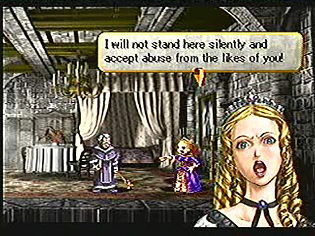 The Princess, Jelanda, screams at Longbert and tells him to STFU. I’m torn between being frightened by her scary face and wanting to cheer for her very healthy backbone. Then Jelanda tells Longbert that she’s torqued because she “cannot allow such behavior from a boorish mercenary…” but Longbert cuts Jelanda off before we can hear what the mercenary did, exactly, to piss Jelanda off. Longbert tells Jelanda that she needn’t concern herself with the peasantry and assures her that he will set things right. Jelanda, placated, (she even gets a new, significantly more attractive portrait to demonstrate this) acquiesces to Longbert’s long-winded instructions. Longbert returns Jelanda’s scepter to her and takes his leave. Then, because Jelanda is je-spoiled and has to have the last word, she chucks her scepter after him again. It makes the same tinkle noise as it bounces across the stone floor.