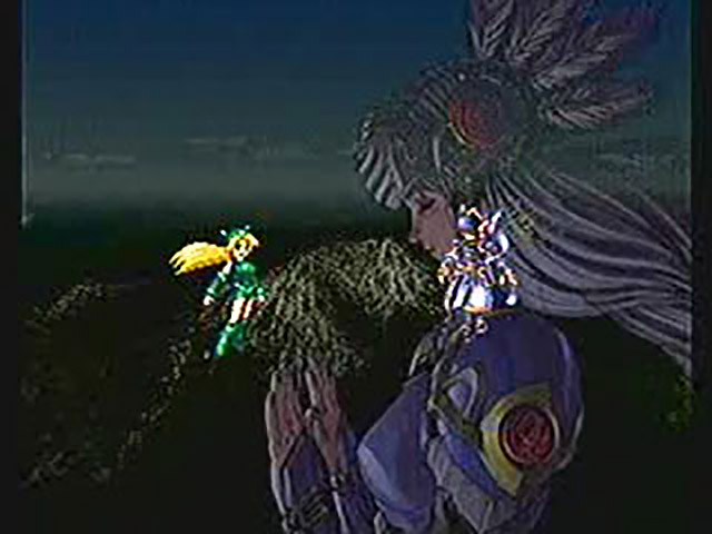 Man, these knights suck! During the three seconds since we saw them run through the last frame, three or four have already been struck down and are sprawled across areas of the screen, and the surviving knights are all holding their swords at the ready, but rather than fighting, they’re all just rocking back and forth. As the camera pans to the right, we see the fearsome adversary that laid waste to the knights… and it’s a Harpy. (No, not Rinoa.) You know, one of those scaled women with claws and wings? Anyway, I hope this is like, Queen of the Harpies (No, not Shion) or something, because it’s kicking these knights’ asses. Arngrim, cool as a cucumber, enters the scene and, after calling the Harpy a nuisance, orders his fellow knights to get out of the way. As Arngrim approaches the Harpy, Heath appears and announces that he’s gonna help, too. So I guess that part five seconds ago where Heath sent Arngrim to help was just one of those “I’ll go after you; it’ll look less conspicuous” moments.