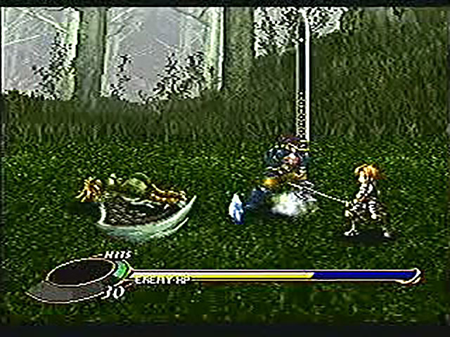 Oh, I guess we’ve “synchronized our soul” with the dying hero in question, because battle music wells up in the background as we see two warriors, one in armor with fabulous hair and a poleaxe and another with a really gay-looking shirt that doesn’t even cover his stomach (but he’s got a huge gauntlet on his arm, for some reason), run onscreen. Poleaxe guy lays a smackdown on some random purple ape that was hopping in place in the middle of the path, clearing the path for several generic knights to trample through onto the next screen. Poleaxe guy, who I’m just going to call Heath from here on out, because he looks like the poor man’s Heath Ledger from A Knight’s Tale, turns to gay shirt man: “Arngrim, help them out, won’t you?” Arngrim wordlessly follows his fellow generic knights onto the next screen.