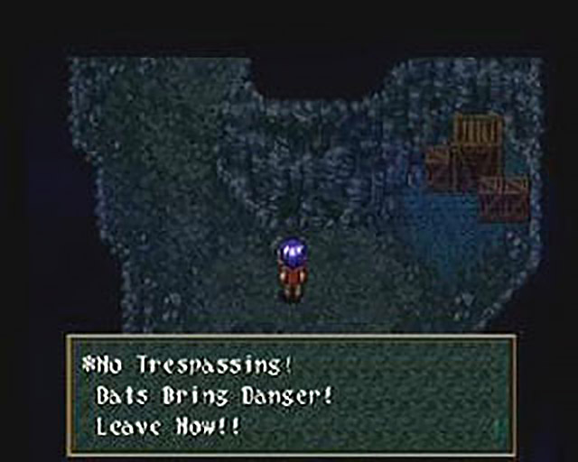 One moment of excitement arrives when Rudy comes across a sign warning: “Be Quiet! Footsteps may wake bats! Take it slow and easy!” Heeding this warning, Rudy blows the sign to smithereens and proceeds to stampede down the tunnel. My rebellious streak almost proves to be my undoing when I hear the sinister chittering of bats, who then swarm towards Rudy like fangirls to a Hobbit at a LotR convention. I’d wager that the bats are less scary, but I digress. And fangirls – hold the bitchy emails. I love Hobbits too. As it turns out, the several black fangirl!bats do nothing other than flap in an annoying manner around the cave, while one distinctive red bat sticks to Rudy like shit to a blanket. In fact, it signifies the ‘Curse’ status effect, which ups the random battle count by a considerable amount, as if it weren’t high enough already. For the record, I have no idea why the curse takes the form of a bat flying irritatingly around Rudy’s head, and I can’t help feeling that it would be more appropriate for said curse to appear in the guise of Tidus, or herpes, or an embittered former forum poster who just can’t let go.