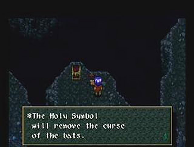 Thankfully, another helpfully-placed sign a few battles away tells me that “The Holy Symbol will remove the curse of the bats”. Well, that’s peachy. Or it would be if I actually had a Holy Symbol. Luckily for me, one can be procured from a chest sitting right next to the Sign of Helpfulness. It may just be me, but I don’t like how generous the Game Designers are being at the moment. It unnerves me.