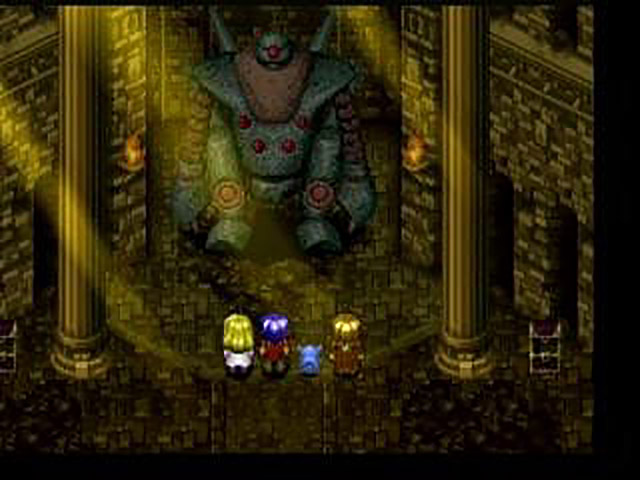 In the room with the “spooky demon statue”, Cesuelia uses her Tear Drop to break the seal on a huge door. Unfortunately, the gargantuan monster Emma failed to mention earlier emerges and attacks. The monster (called “Magtortous”) looks intimidating (well, as intimidating as something can look when rendered in God-awful blocky graphics, at least), but our heroes with their L337 Lv 4 skillz ensure that it goes down faster than a plane piloted by Tidus, with Shion as co-pilot. I is winnar!