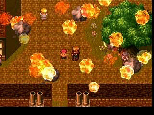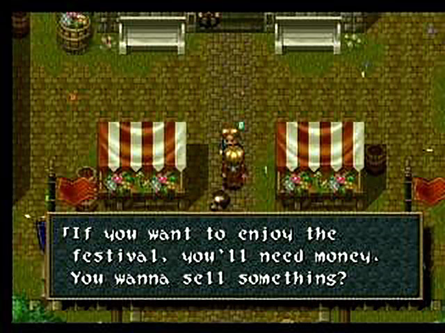 First prize having eluded Rudy, he heads over to the eastern side of the festival ground (bypassing an equally annoying minigame involving throwing a ball at a target) and is accosted by a flustered young woman who is looking for her child. Rudy and Indy, being heroes and all, agree to look for the boy, marking the second “save my kiddy!” event of this recap. Apparently the lost boy is holding a red balloon, rendering him distinguishable from all the other NPC kid clones, so the Cliché Trio -1 heads back into town to begin the search. Before long they find the kidlet, complete with his red balloon, which duly escapes from his grasp and floats up into the sky. Right at that moment, the sky darkens and the jolly festival music stops abruptly. Houston, we have imminent disaster.