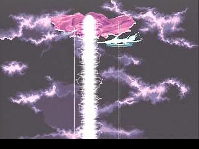 The camera pans upwards and we see a shot of an angry purple sky, with black clouds a’rollin’in, as dramatic music kicks in. Jagged lightning pierces the clouds as the kid’s red balloon ascends to the heavens. As the townspeople “watch the silent nightmare spread over their heads”, something completely mind-boggling happens. The sky cracks. Yes, the sky itself cracks open. I think my brain just broke. Behind the cracked sky, a swirling purple vortex is visible. Phallic beams of light flare out of the fissure as fragments of the sky fall like shards of glass. “The ‘Beginning of the End’ is here…” our old acquaintance the Random Text God scrawls across the screen. “A sword of light strikes the land and a wall of fire rushes across the horizon.” Folks, this isn’t good. And if this scene was created without the influence of mind-altering substances, I’m Jesus of Nazareth. As the sky continues to break apart, complete with cracking sounds, we fade back to normal gameplay mode. Before Adlehyde’s citizens have a chance to catch their breath, fiery meteors rain down on them and engulf the town in flames. Man, this day is going from bad to worse, huh?