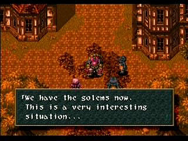 “Give this message to one of the humans running into the castle,” Squatt instructs one of his generic cronies. “If they don’t give up the ‘Tear Drop’, we will tear this castle to pieces!” The dialogue in this scene was obviously written in crayon by the script editor’s infant child. Another generic monster runs onscreen and informs Squatt that there are golems in town. Pleased that the golems lay dormant, Squatt replies “All junk? Good! We don’t want to fight those things…” He turns towards the camera. “We have the golems now. This is a very interesting situation…” Then he does his stupid laugh again as we fade to black. This guy needs to die, preferably in a situation involving boiling oil, red-hot pokers and multiple forced rewatchings of the FFX pond scene. It’s a good job he won’t be around for long, or my sanity would have been at risk. Equally fortunate is the fact that this recap draws to a close – I’ve had more than my fill of Filgaia for the time being. Next time, one of our beloved heroes gets a haircut. Now how’s that for a cliffhanger?