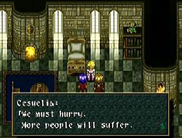 Cesuelia pleads with her dad. “But if I do nothing, many will die because of me!” she whines. It would have been so unexpected and refreshing if she’d said “Oh well, shit happens. Now, what’s for supper?” I swear if I ever make a videogame (about as likely as me becoming King of England, but I digress), I’m using that. King Adlehyde hilariously tells Cesuelia to go to her room. And…she does. Scene.