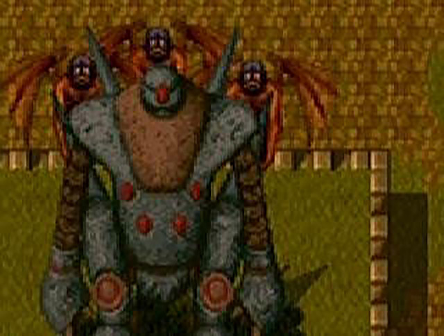 The camera pans up over the Ruin Festival ground. By some small miracle, everything in the area remains unspoiled with no signs of damage, despite the fact that the entire town was pelted with meteors just half an hour ago. Whatever, Trevor. The flags are still flying, reflecting the courage and determination of Adlehyde’s citizens in the face of adversity and fiery death. Or something. We see the three dormant Golems — Lolithia, Barbados and Diablos — being prepared for airlifting by the most terrifying winged demons ever. I mean, these guys have brain-eating zombie grins that would put Tightass to shame. And as if that weren’t enough to send me into the corner, curled into a ball with a blanket over me, they take the opportunity to burst into a fit of exposition. “[Squatt] is a slave driver. Why do we have to take this junk back?” one wanks. “We have to do what we’re told…we’ve got to get this done,” another replies. Well whaddaya know, even flesh-munching demons have some sense of duty. I wonder if they get pay rises? As the demons begin to lift the first Golem, their scary grins are replaced by not-quite-as-scary constipation grimaces. I laugh myself silly as we fade out.