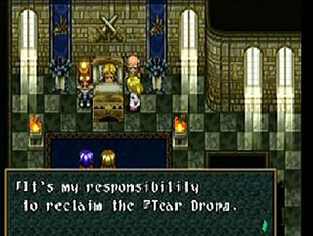 Back at King Adlehyde’s deathbed, Cesuelia apologizes for defying him and giving Squatt the Tear Drop. Yeah, sure. If you were really sorry you wouldn’t have done it in the first place, Miss Morality. Didn’t they teach you that at the Mary Sue Abbey of Religious Indoctrination? And, of course, daddy dearest forgives his precious snowflake immediately. Never mind the fact that she just let the Tear Drop fall into evil hands, the one thing he was adamant that Must Never Happen. This game makes no sense. Excuse me — I’m just going to bang my head against a wall until the madness stops. I may be some time.