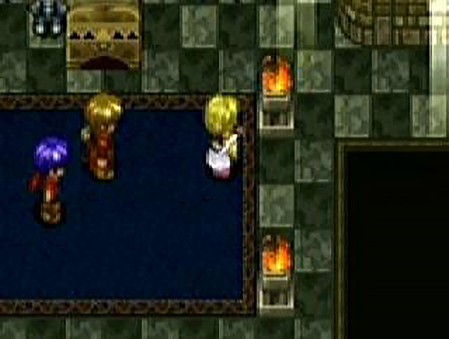 There, all better now. Cesuelia tells her daddy not to talk, and that he must conserve his strength — a cliché classic piece of dialogue which, in 99.9% of instances, indicates that the reaper’s scythe is about to fall. I swear, it’s like a death sentence. If you’re ever injured and somebody tells you not to talk, you’d better start praying. Either that, or hope they say “Feel free to talk all you want! There’s no need to conserve your strength!” Cesuelia isn’t done yet. “It’s my responsibility to reclaim the Tear Drop,” she dumbasses — I for one totally thought it was the chef’s duty — causing the king’s wanky adviser, Minister Johan, to exclaim “Princess!” in such a horrified manner that I wonder if she’s just strangled a puppy or something. She ignores his cry, continuing her monologue (even her dad’s impending death can’t shut this girl up). “I have made my decision. Our resources must be conserved for the reconstruction of Adlehyde!” she declares. “I have trusty friends. With their help, I will reclaim the Tear Drop.” This dialogue is so awkward and stilted (or should that be Stilton?) that’s it’s actually making my flesh creep. I think I need a shower. While she pours her wank out, her “trusty” friends stare in morbid fascination, desperately trying to block her out by placing their hands over their ears.